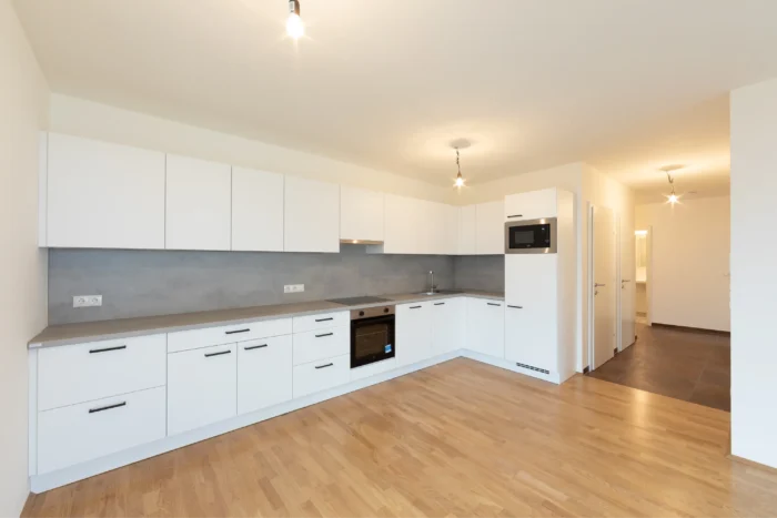 Im Mietpreis inbegriffen sind eine hochwertige, neue Einbauküche und ein nicht überdachter Autoabstellplatz. Die Wohn- und Schlafbereiche sind mit Parkettboden und Fußbodenheizung ausgestattet, und für angenehme Kühle sorgt die innovative Deckenkühlung.