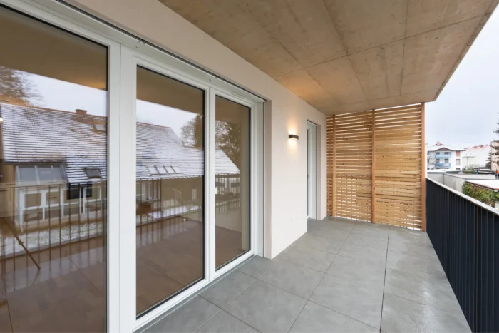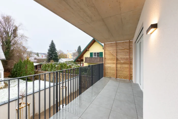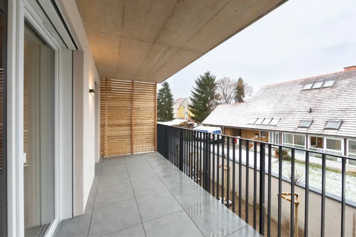 Top 8 befindet sich im Obergeschoss und bietet 65,74 m² Wohnfläche. Genießen Sie die frische Luft auf Ihrem 11,82 m² überdachten Balkon.
